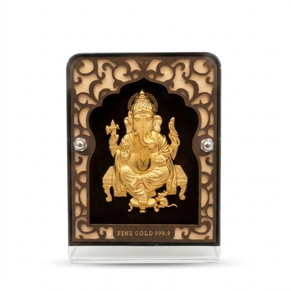 Whether you are looking for a pure 24k gold foil ganesh idol with acrylic frame for home mandir or a premium decorative piece for a large executive desk, this frame provides a commanding and luxurious presence.