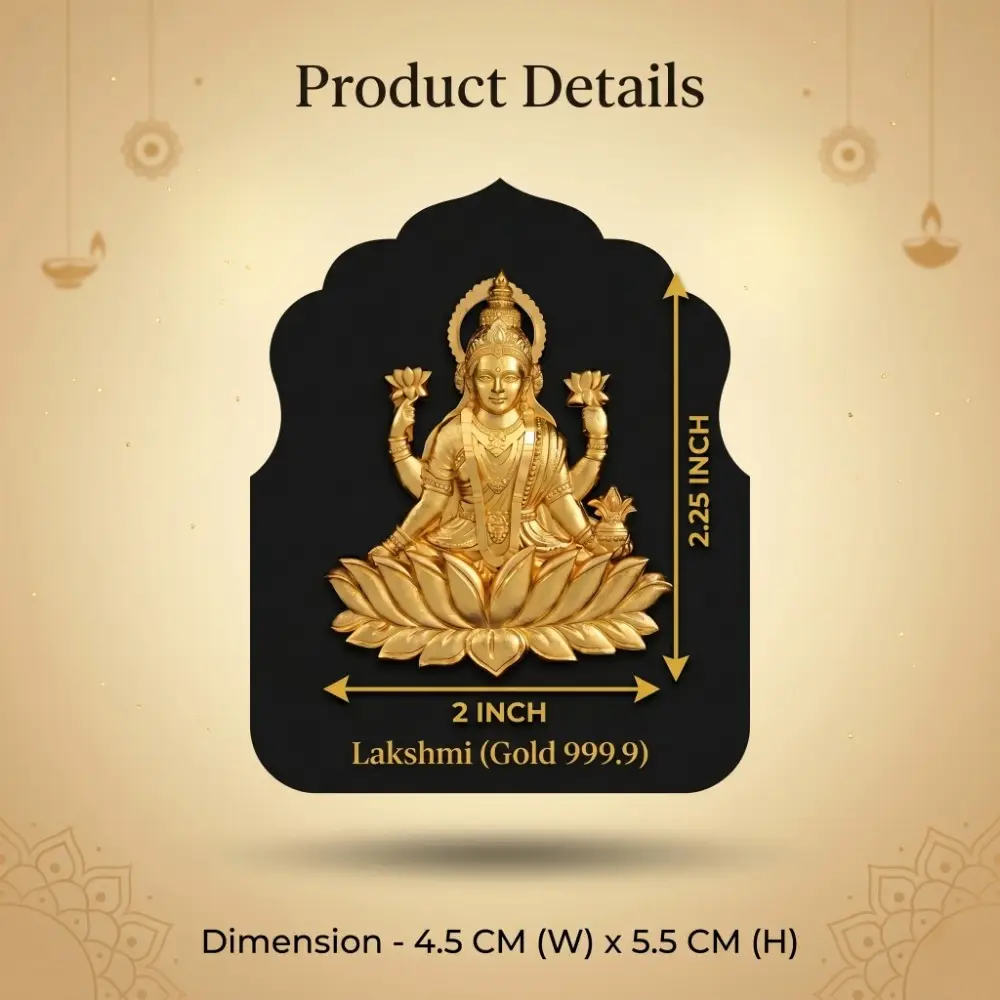 The centerpiece features a stunning, grand deity meticulously embossed on a high-quality 24kt gold laxmi frame. We ensure absolute authenticity, which is why the “999.9 Fine Gold” hallmark is clearly displayed on the base. The intricate detailing of the Goddess seated on her divine lotus radiates a rich, golden brilliance that instantly elevates the aura of any room.