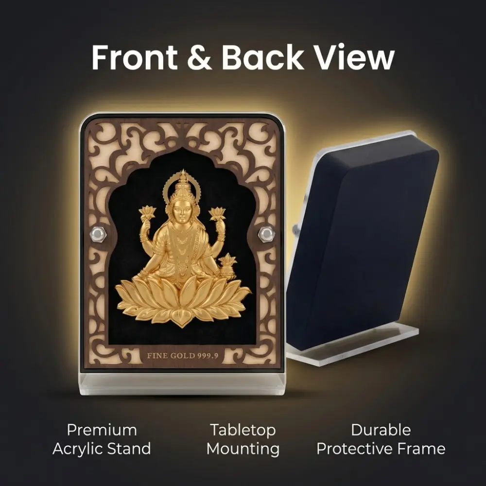 Whether you are placing it in your spacious home mandir, keeping it in your main office cash box (Tijori), or looking for a large pure 24k gold foil laxmi idol with acrylic frame for corporate gifting, this larger frame delivers a commanding, luxurious presence that leaves a lasting impression.