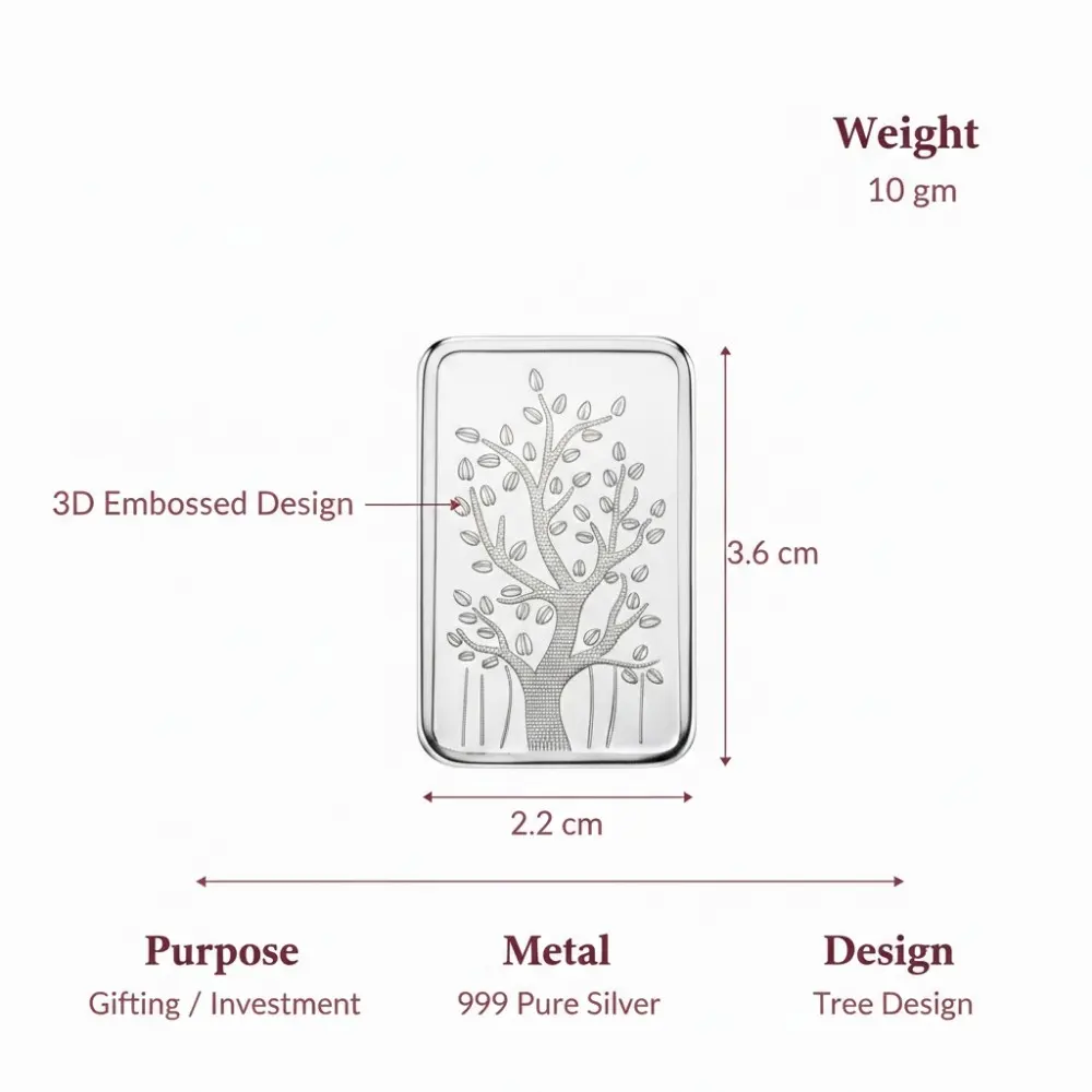 • 999 Silver Bar 10gm showing weight and dimensions, 3D embossed tree design on pure silver bars for gifting