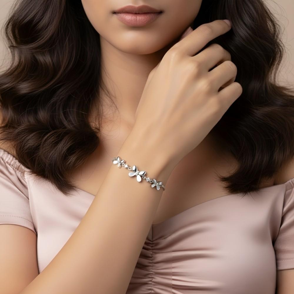 Add a touch of elegance and charm to your wrist with this Elegant Silver Butterfly Bracelet with MOP Charms, designed to reflect grace and transformation.