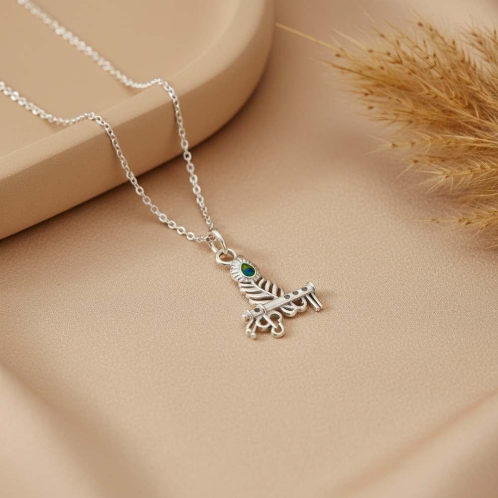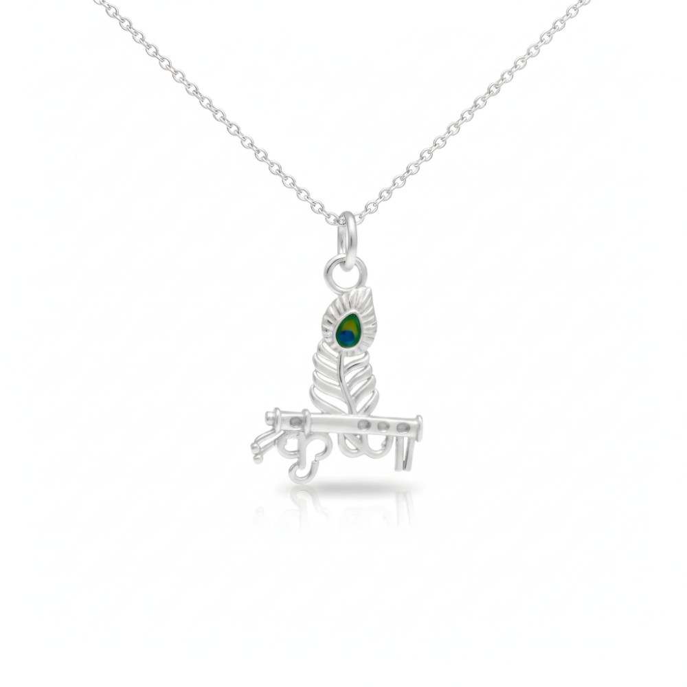 • 925 silver Krishna morpankh pendant necklace with flute and peacock feather design