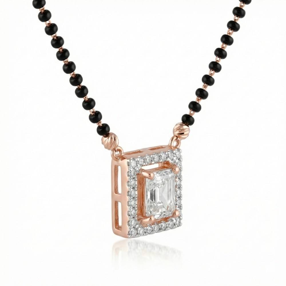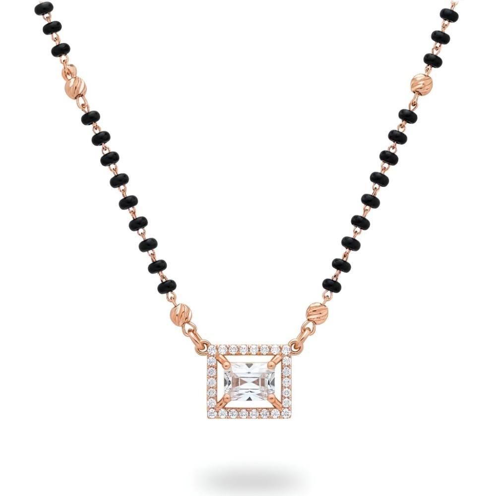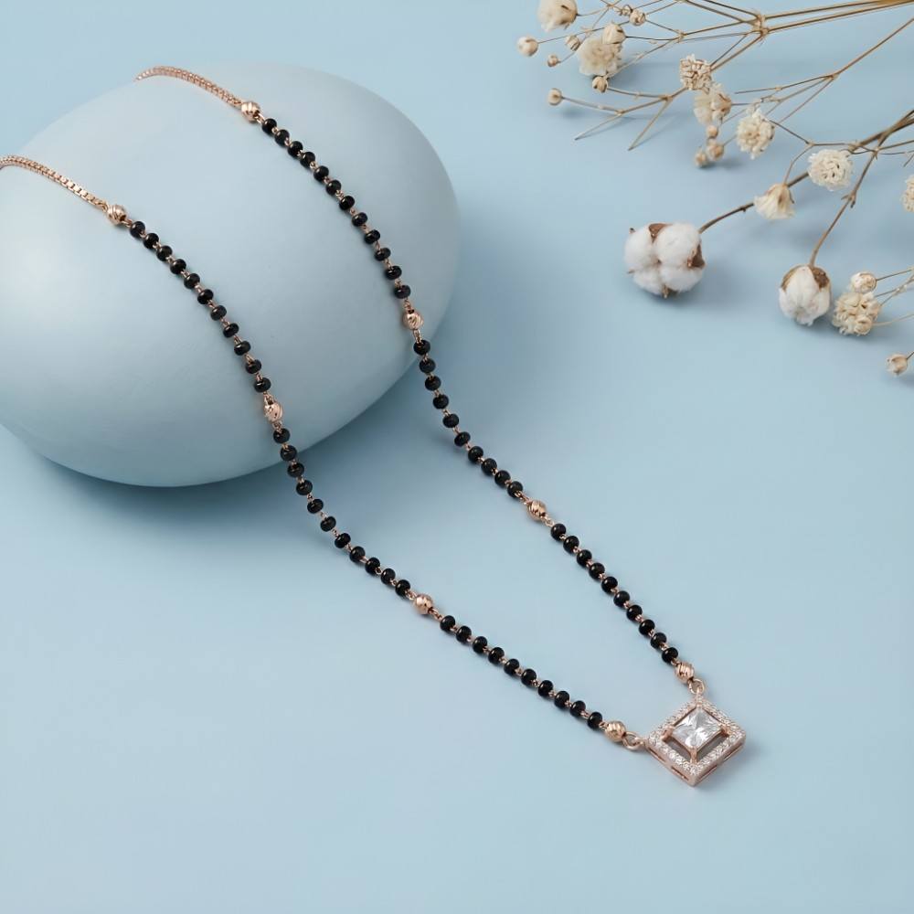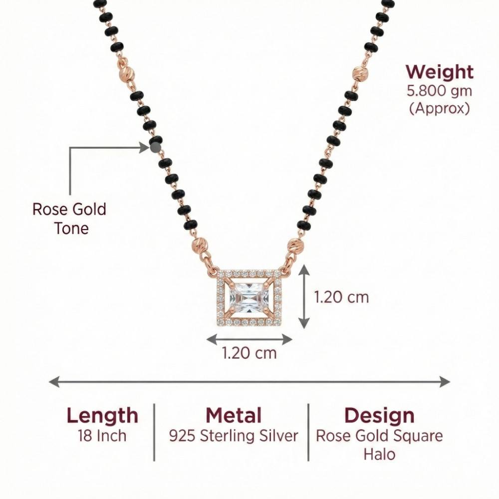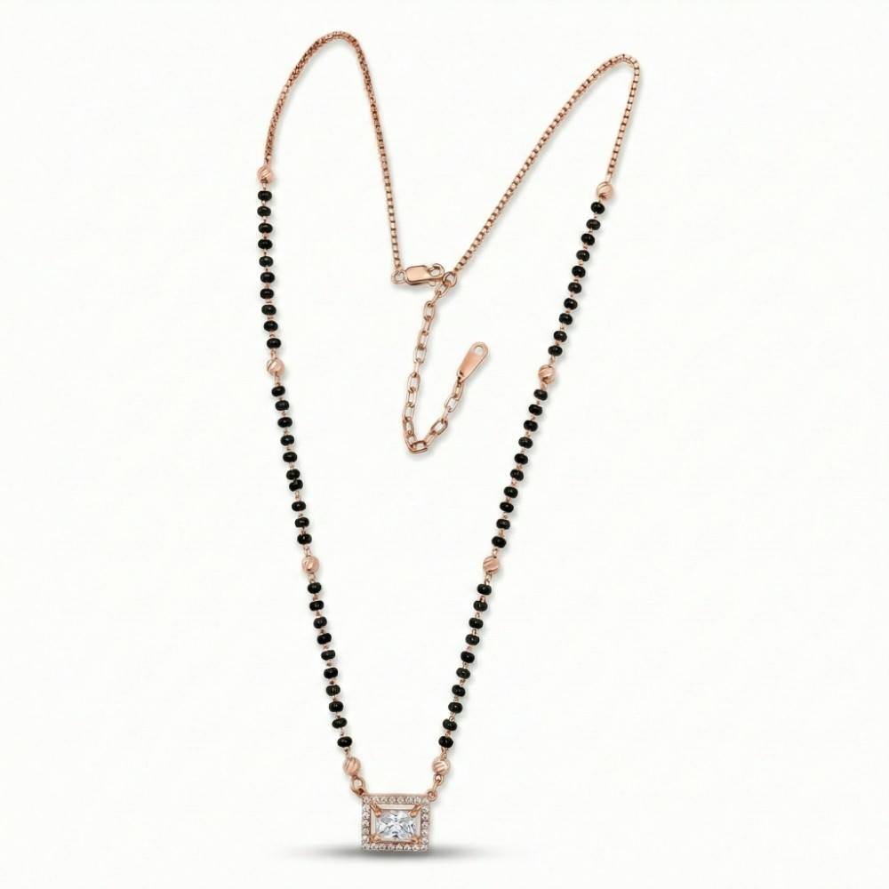 Crafted for women who love subtle luxury with cultural roots, this Rose Gold Square Silver Mangalsutra Necklace is a perfect blend of tradition and modern elegance. The center features a beautifully cut square CZ stone surrounded by a sparkling halo, finished in a warm rose gold tone that adds a soft, feminine glow.