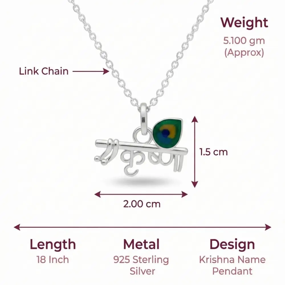 Embrace your devotion with a deeply personal and elegant touch. Our beautifully crafted Krishna name pendant necklace is designed for those who want to keep their faith close to their heart every single day. Crafted from pure 925 sterling silver, the centerpiece of this design highlights the divine name ‘कृष्णा’ written in a beautiful, flowing Hindi script. To complete this spiritual masterpiece, a delicate peacock feather rests gracefully above the name, hand-finished with vibrant blue and green enamel that captures Lord Krishna’s vibrant energy.