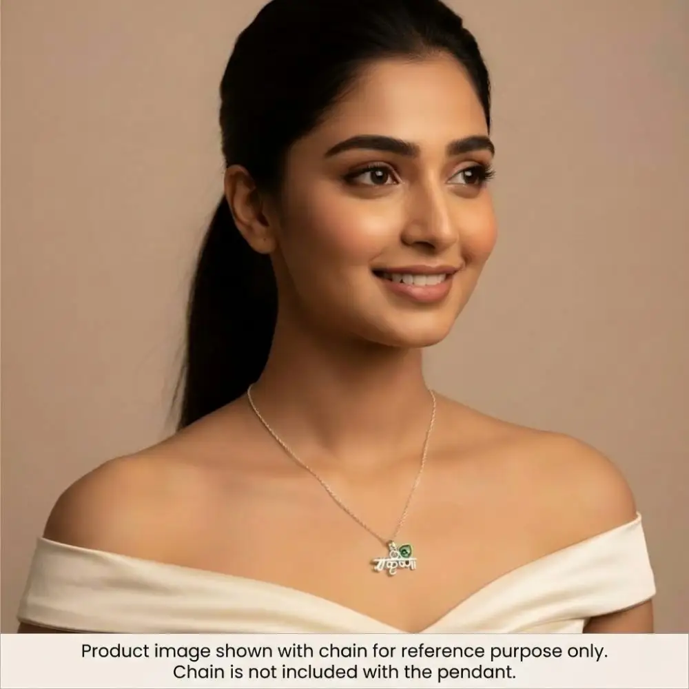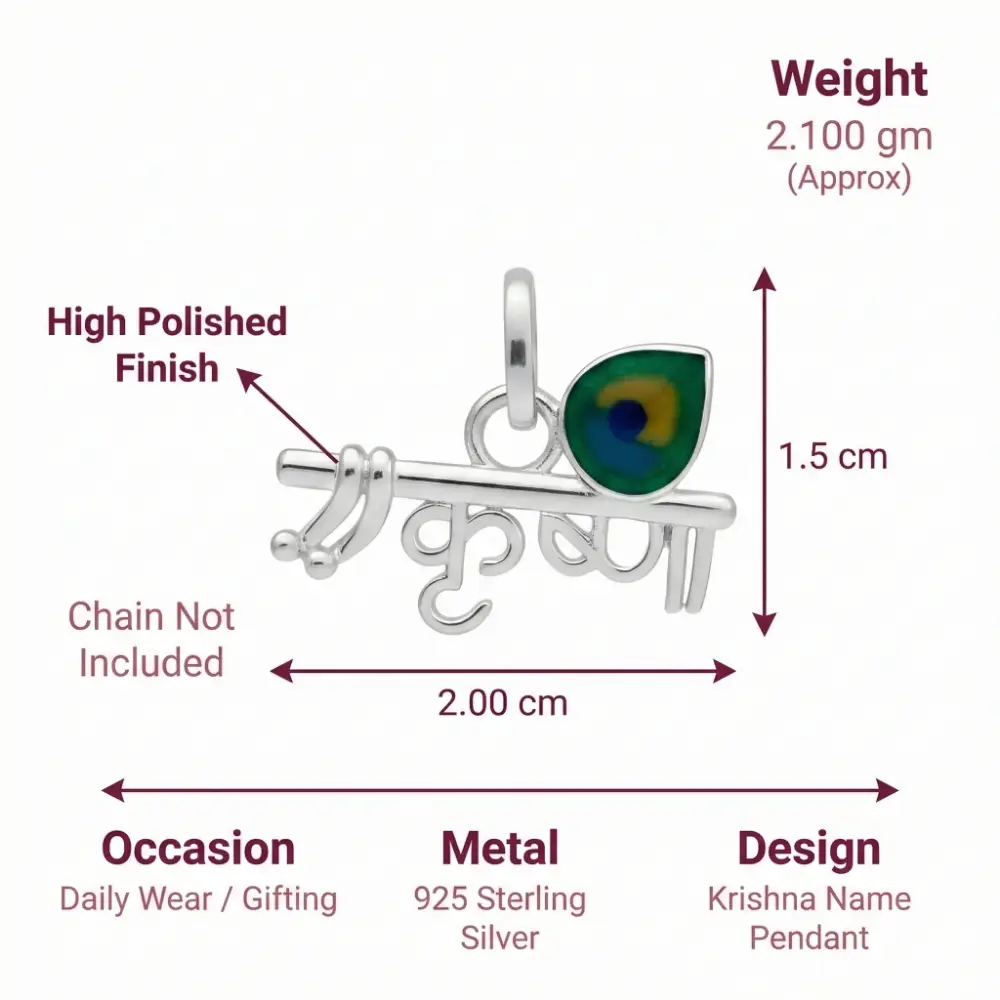 The design features the name “Krishna” (कृष्ण) beautifully written in elegant Hindi calligraphy. The upper stroke of the name seamlessly transforms into a silver flute (bansuri), while a vibrantly enameled peacock feather rests gracefully above it. This intricate fusion of text and symbol makes it a truly standout accessory. Whether you are looking for a personalized spiritual piece for yourself or a meaningful krishna name locket silver to gift someone special, this standalone pendant captures the essence of divine love and melody perfectly.