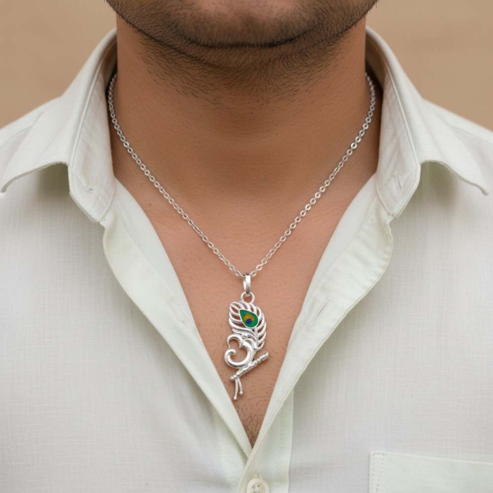 • Man wearing silver Krishna peacock feather pendant necklace with flute and Om symbol