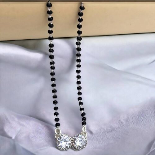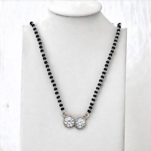 Introducing the exquisite Silver Solitaire 2 Halo Mangalsutra, a masterpiece that embodies the essence of timeless elegance and profound devotion. Meticulously crafted to perfection, this enchanting piece is designed to celebrate the sacred bond of marriage with grace and sophistication.